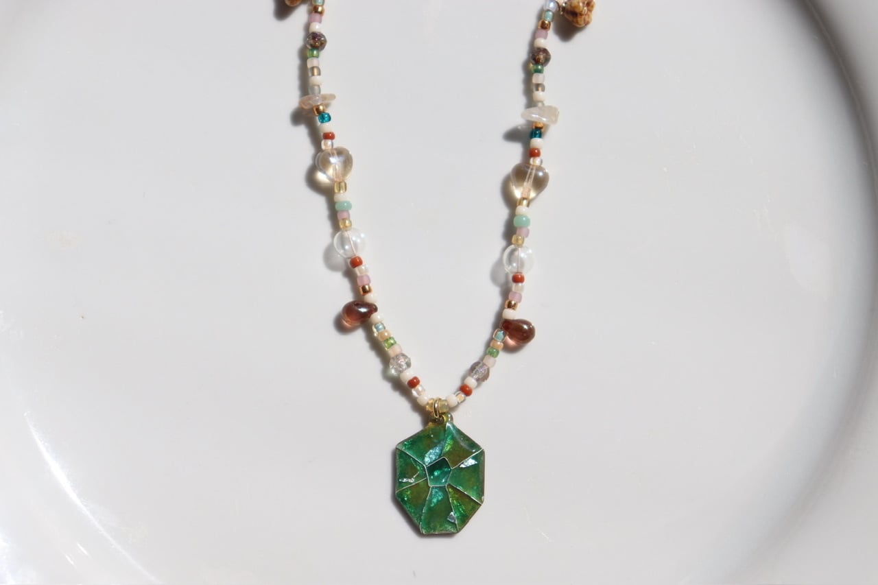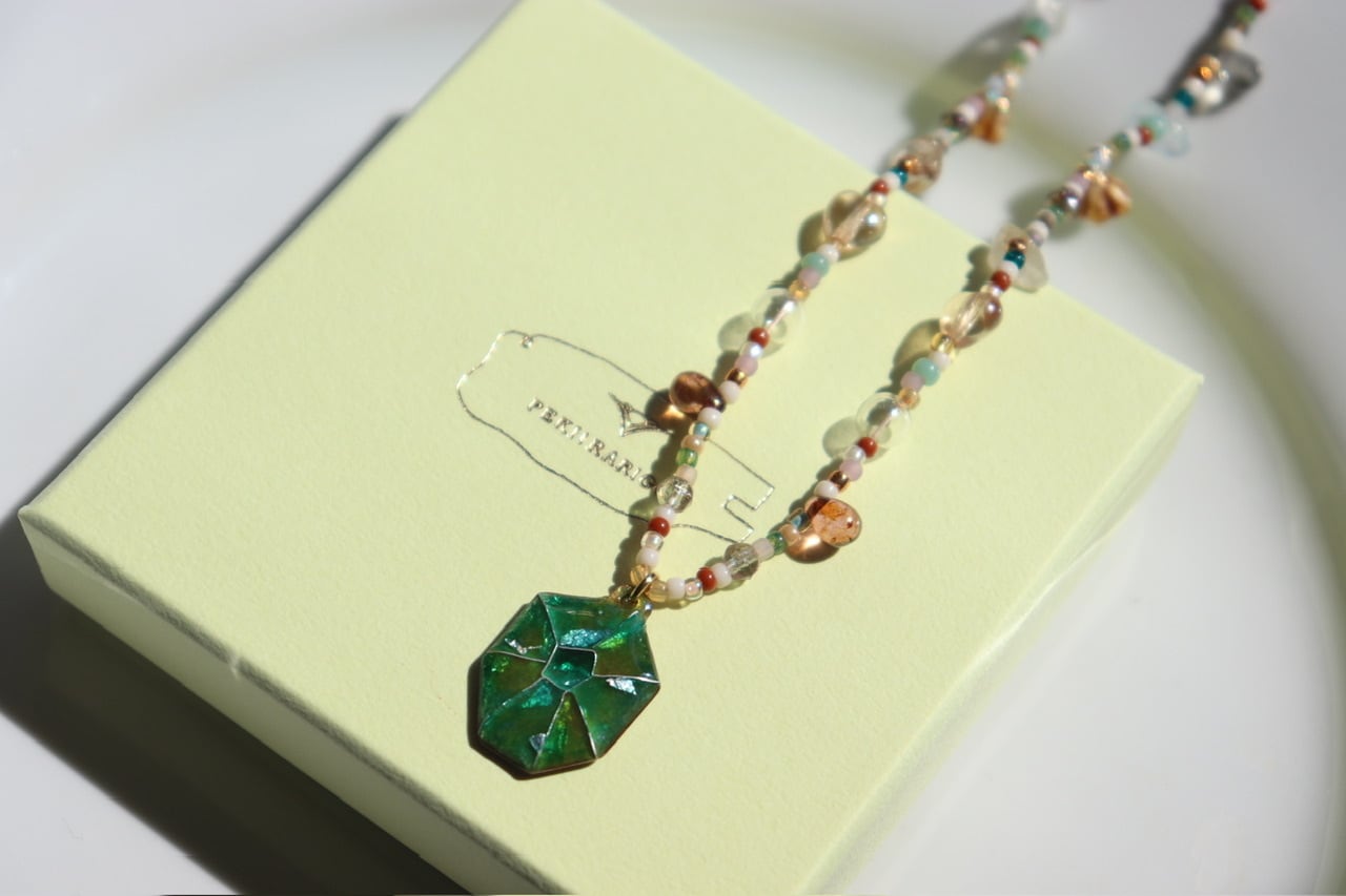キラキラした宝物を散りばめるように、ヴィンテージビーズなどをあしらえました。