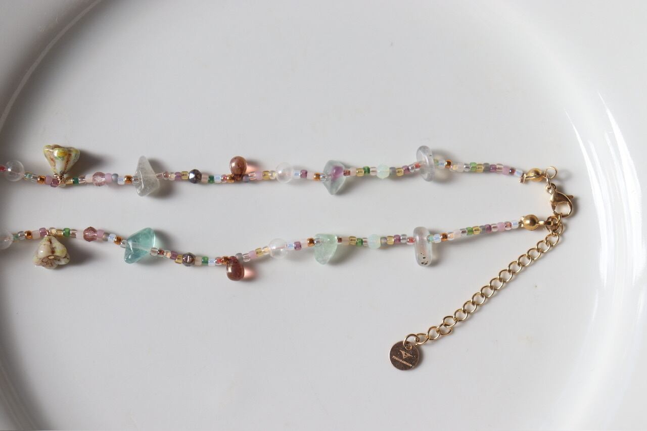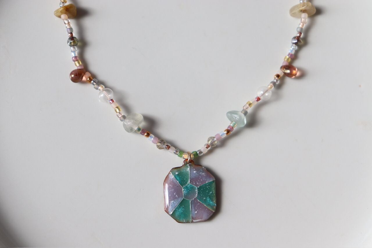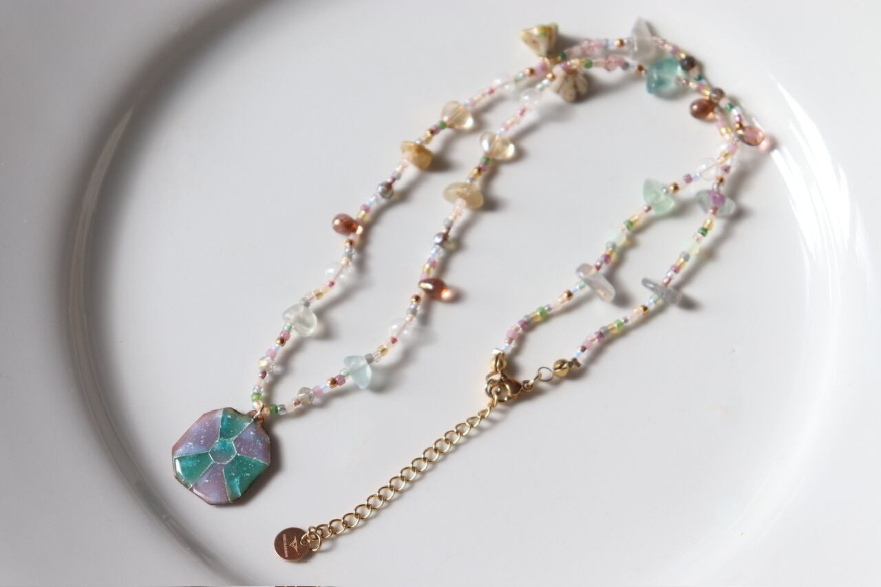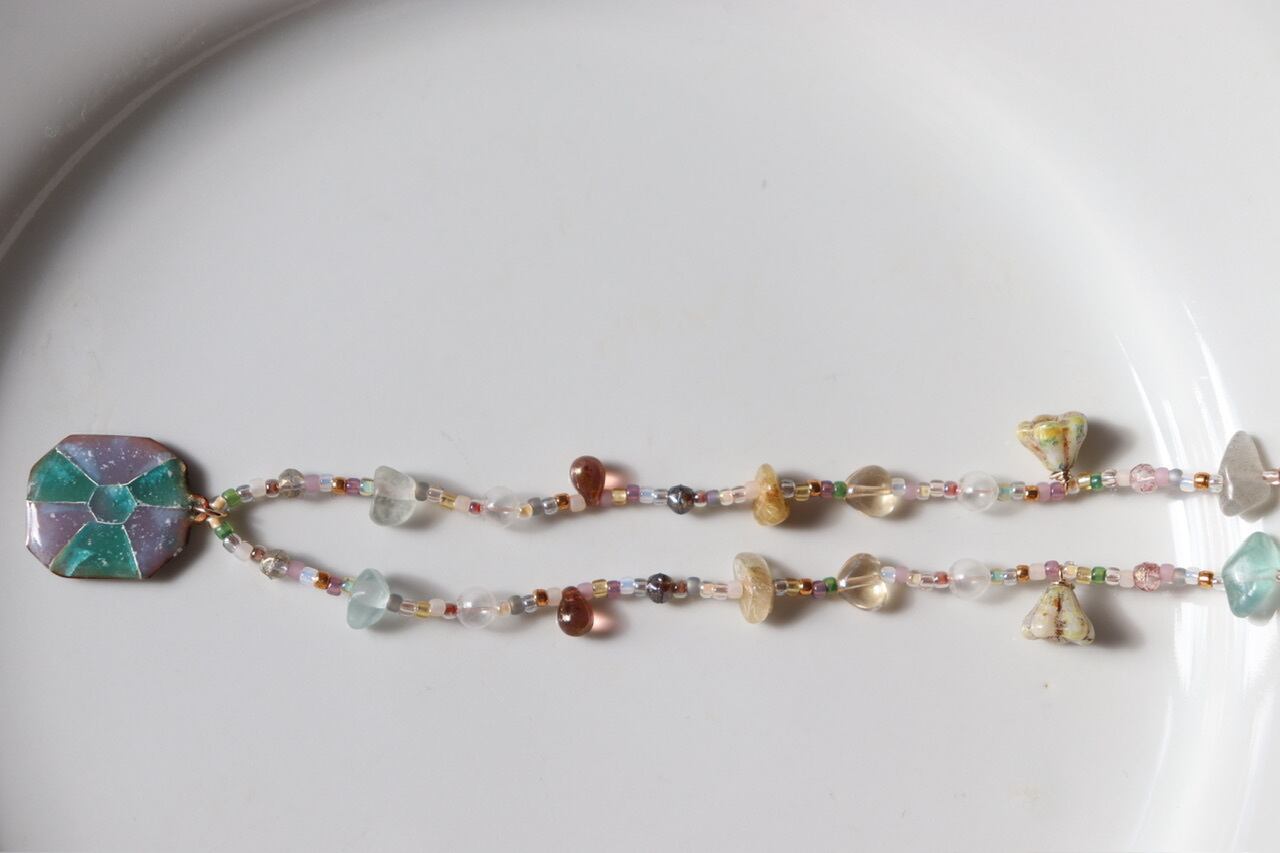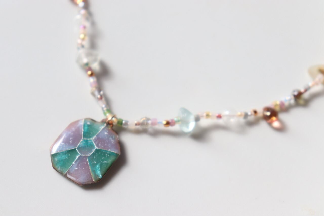 《素材》七宝焼き、ガラスビーズ、天然石、ナイロン製ビーズ糸、サージカルステンレス製アジャスター、14kgfロゴチャーム