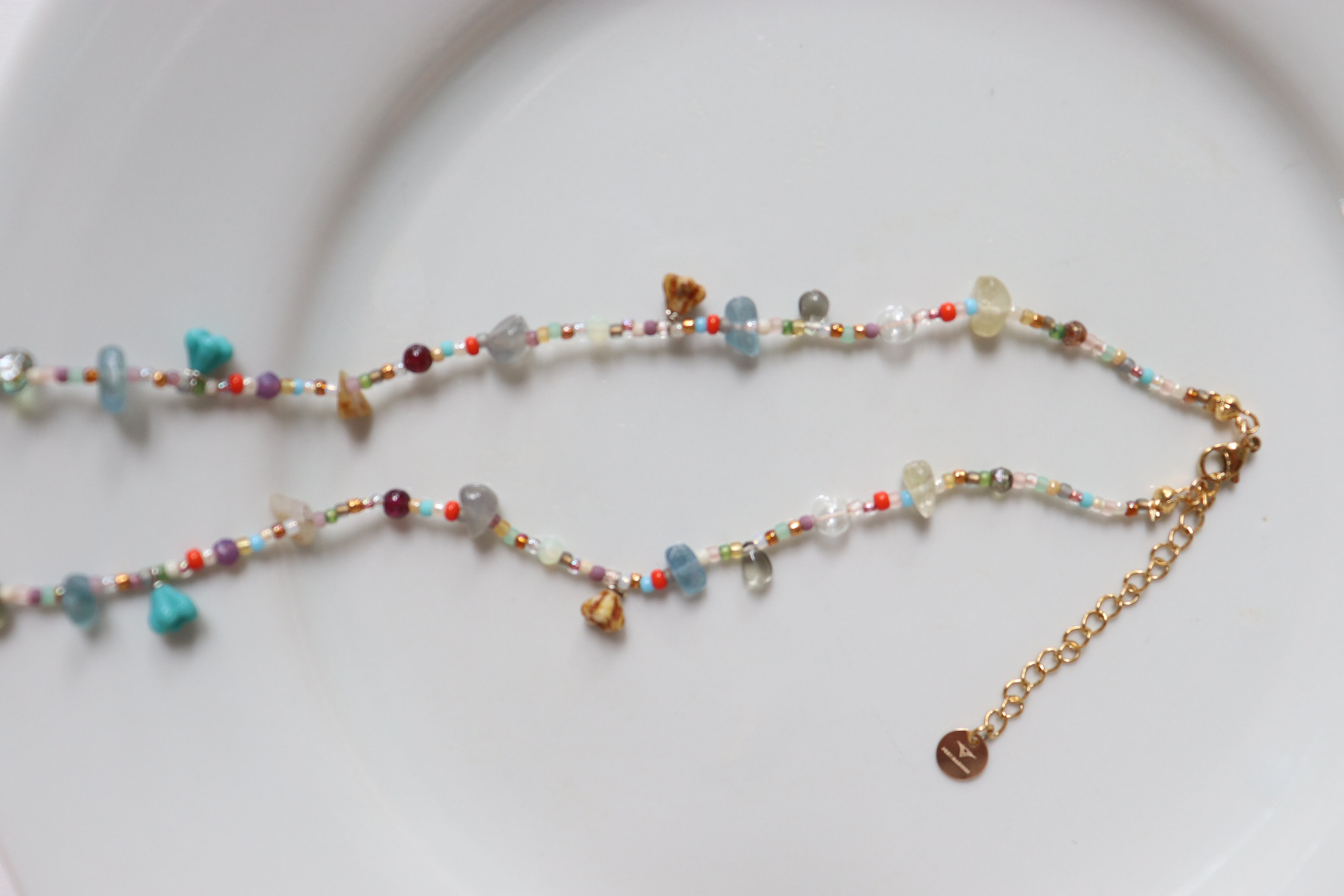 《素材》七宝焼き、ガラスビーズ、天然石、ナイロン製ビーズ糸、サージカルステンレス製アジャスター、14kgfロゴチャーム